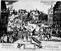 A Gazeta de Amsterdã do dia 1 de abril de 1757 narra a execução do condenado Robert - François Damiens, em grandes detalhes. O local de execução seria a porta da frente da Igreja de Paris, onde seria conduzido “em um carro, desnudo, apenas de camisa, segurando uma vela acesa pesando duas libras, desde ali até a Praça de Grève”. Lá chegando, o colocaram sobre um "platíbulo", uma espécie de plataforma de madeira, para começar a sua morte lenta.